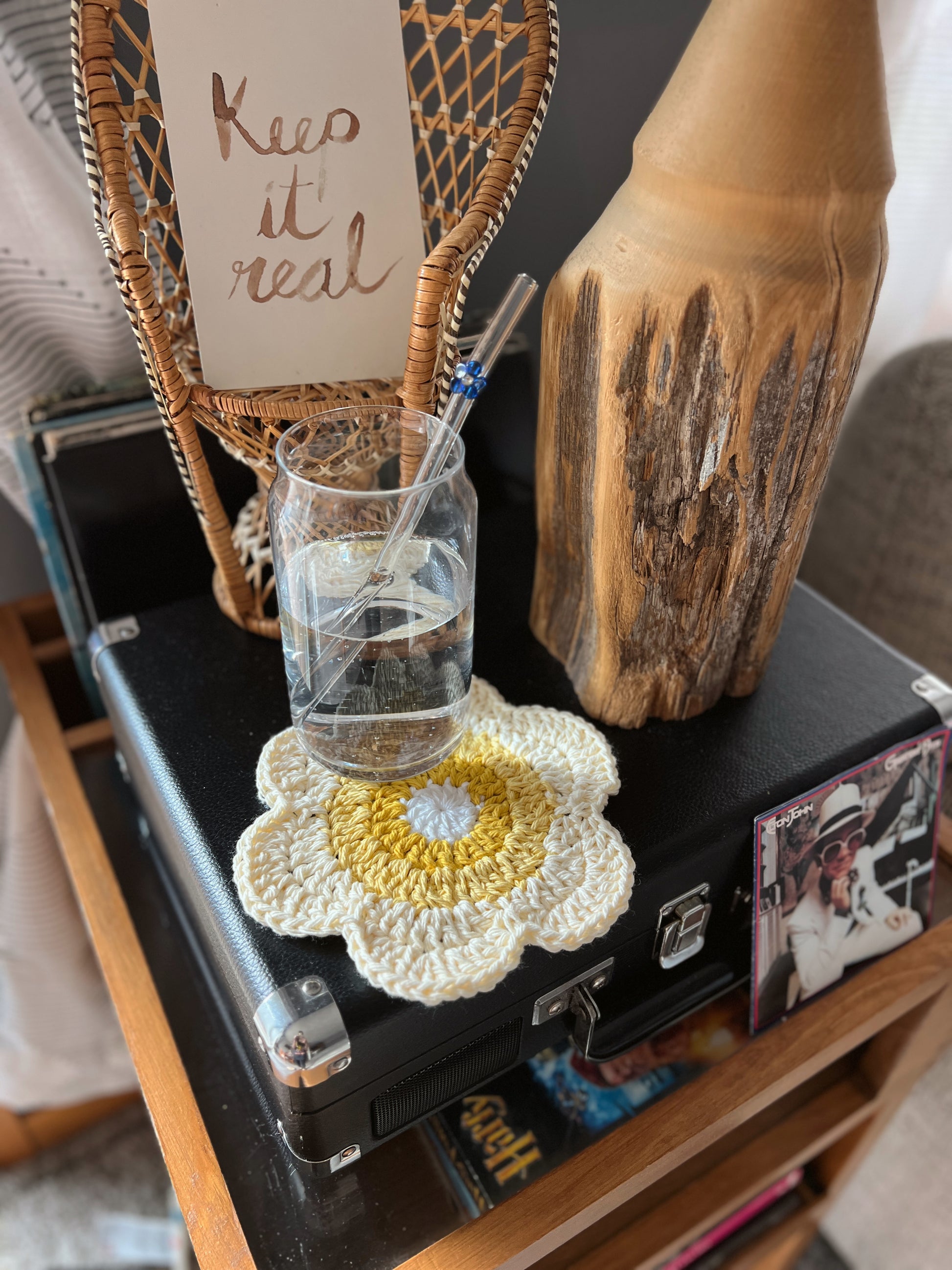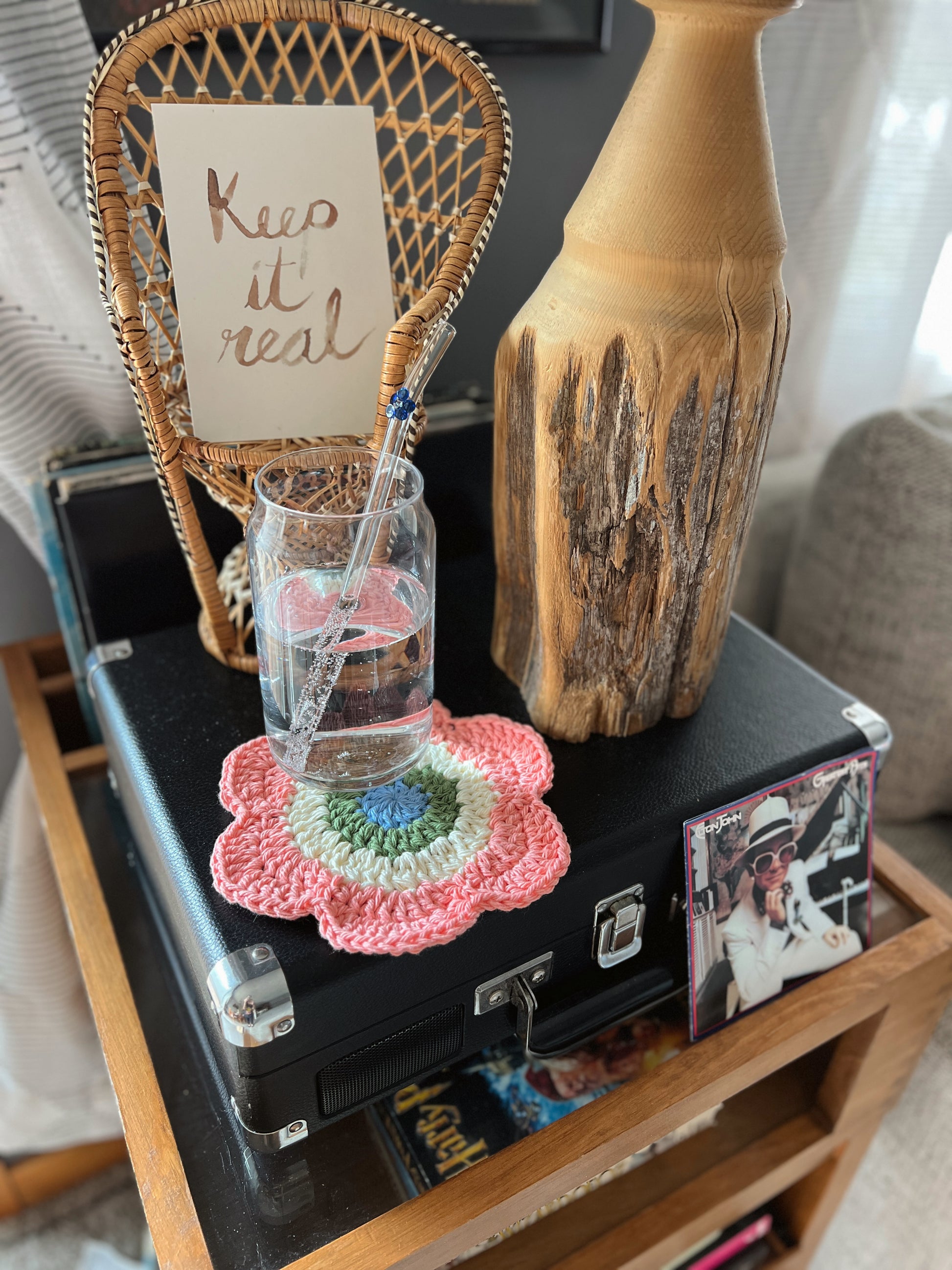 Bring nostalgia to your home with our handmade XL Flower Crochet Coasters. Add to any space in your home like living room, office, or bedroom tables. They work great as a coaster for under your glass & also make for the cutest decor! Select your color choice(s) from the drop down menu.
